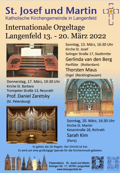 Wir laden zu den internationalen Orgeltagen in verschiedenen Langenfelder Kirchen mit Musikern aus St. Petersburg, Paris, Rotterdam und Essen ein.